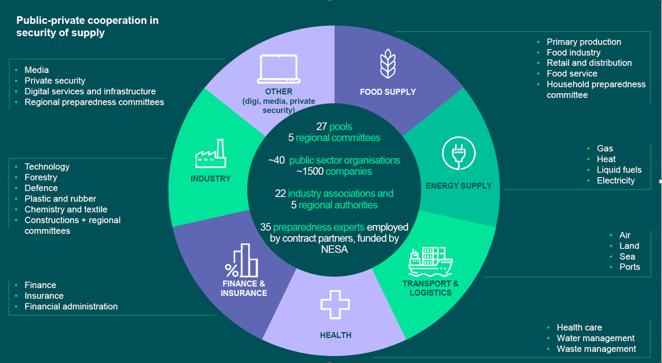 I Finland er det offentlige, næringslivet og det sivile samfunn sidestilt som aktører i beredskapsarbeidet. Næringslivets innsats organiseres i et nettverk bestående av 7 bransjesektorer, delt inn i 27 avdelinger og ledet av fem regionale utvalg. (se modell under)