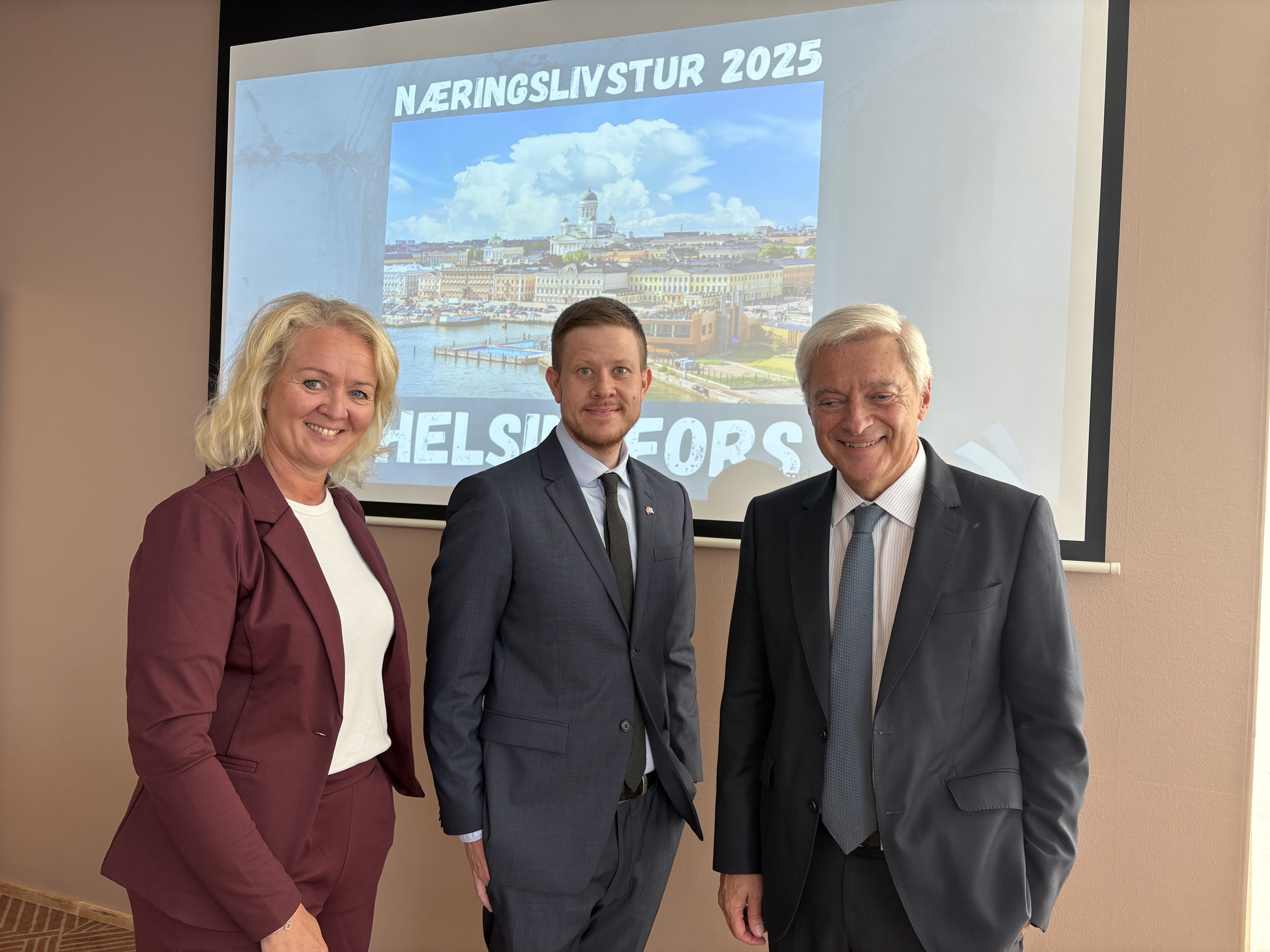 Bilde: Ingrid Dahl Furunes med den norske ambassadøren til Finland, Wegger Chr. Strømmen (til høyre) og hans kollega,.